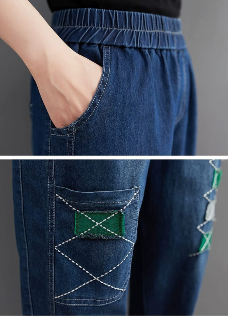 Trendy high-waist denim pants featuring playful patchwork accents and rolled contrast cuffs. Made with a lightweight, relaxed fit for all-day comfort and a flattering casual style.