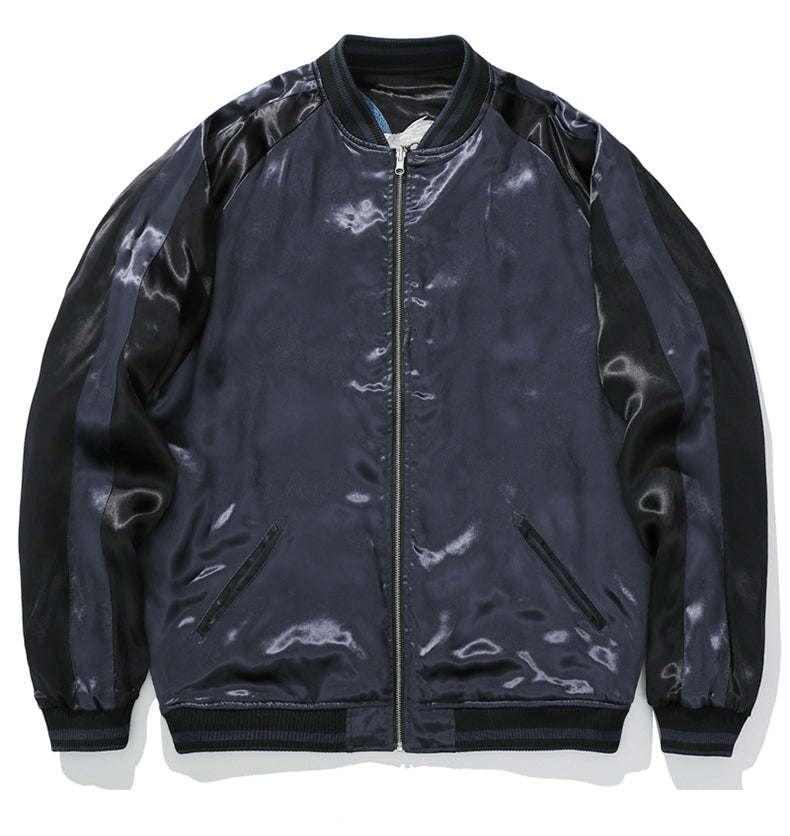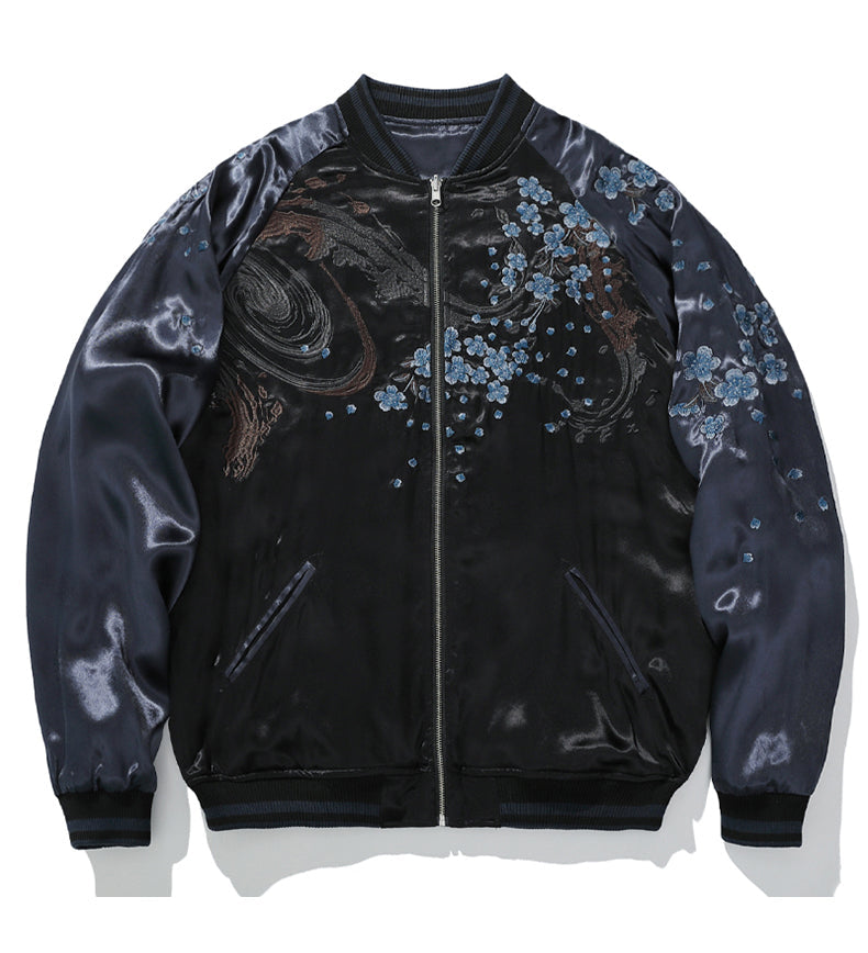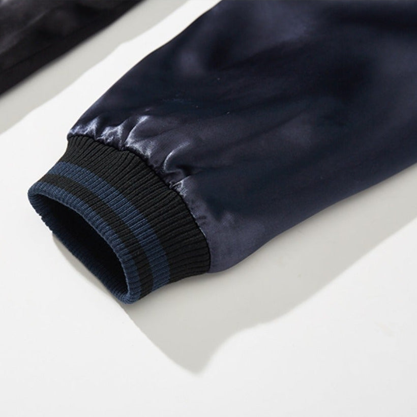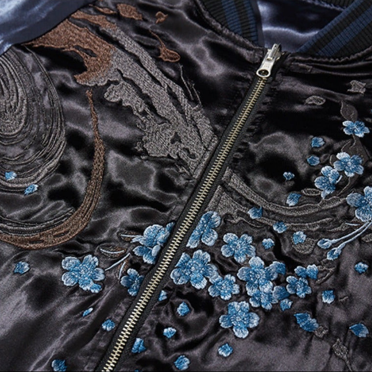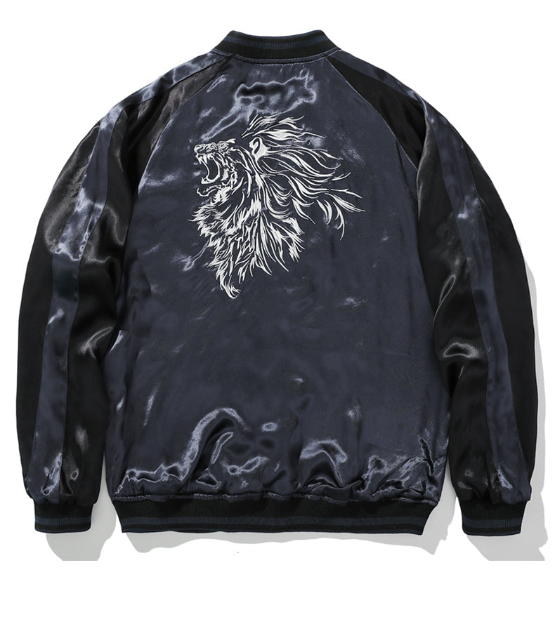 A bold reversible Sukajan jacket featuring intricate heavy embroidery of a majestic lion with blossom details. Designed with a baseball-style collar and crafted from 100% polyester, it offers a smooth, glossy finish and standout streetwear appeal.